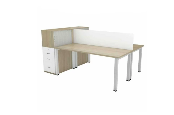 Price is based on – 2 x 1800mm x 800mm desks with 50mm steel frame + 2 x 4 drawer pedestals with central lock + 2 x Roller door top cabinets with silver door and lock + 1 x 1800mm x 450mm melamine desk screen.
